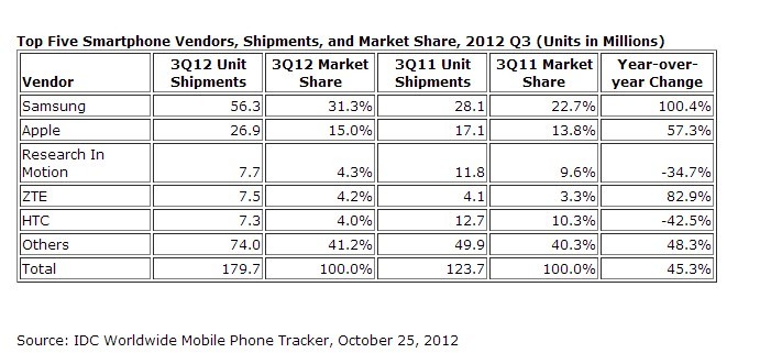 在 10月25日IDC初步發布的市場報告中,索尼并未出現在前五名,三星、蘋果、黑莓、中興和HTC位居前五(見圖)。華爾街的解釋是,因為當時索尼未提供