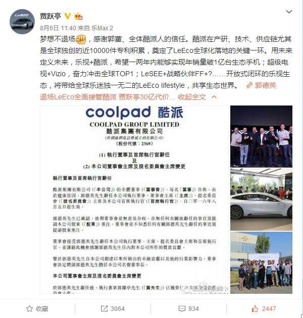 8月5日,酷派發布重大董事會成員變動公告。公告稱,原酷派執行董事、董事會主席郭德英已經辭去其在董事會職位,僅擔任名譽董事長一職。樂視創始人賈躍亭獲任酷派董事會主席及提名委員會主席。8月6日,賈躍亭在微博正式回應出任酷派董事長。這標志著這起歷時長達一年、總額逾30億元的收購徹底完成。