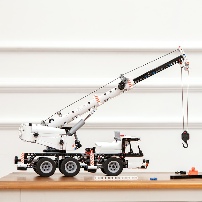 在車子的底盤上,還裝配了一個積木操控臺,能夠實現360°無障礙旋轉,讓米兔積木工程吊車在起重時完成所需的吊裝任務。該操控臺作為全新的積木件出現,可以通過銷子與其他米兔積木相駁接,改造成更加多樣的工程機械。與360°操控臺相連接的就是推桿/滑輪組吊臂系統,該系統通過長齒積木件、推桿和大量的齒輪結構,對現實中的吊車進行模擬、復原。末端和終端的吊鉤,配以引線支撐,可以任意調節吊臂角度和伸縮吊臂長短。下潛吊鉤時,只需要輕輕轉動吊臂旋鈕,終端的吊鉤就會緩緩下降,抵達您的任務點。