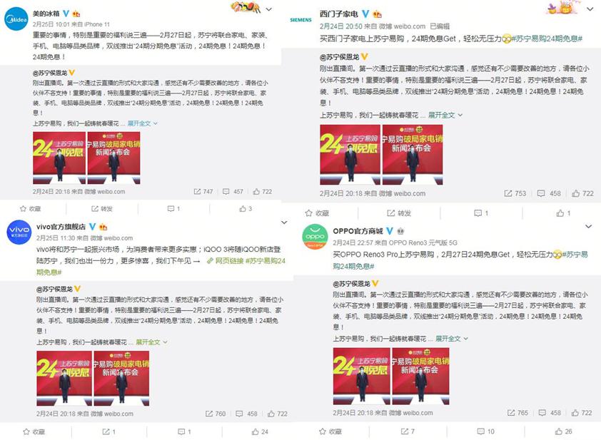 同時,據口碑家電了解,不僅是品牌方的高層領導發聲,據悉自蘇寧發布24期免息政策后,25日開始家電3C各家品牌的各級人員都已全力投入此次24期免息活動。